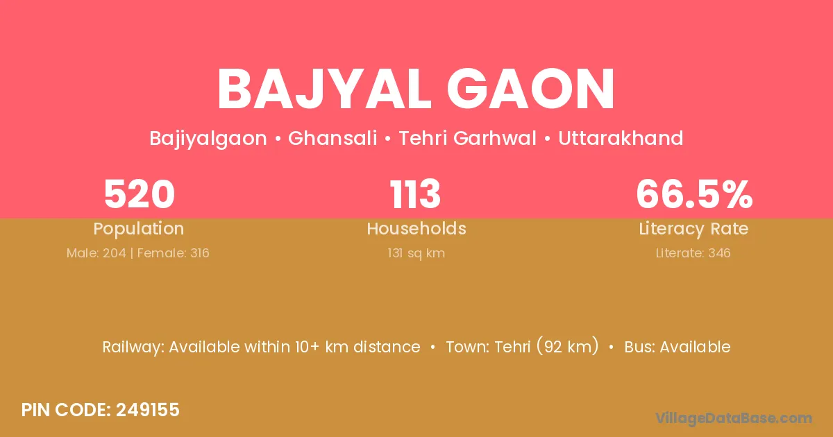 Tehri (92 km) is the nearest town to Bajyal Gaon village for major economic activities and is located approximately 92 km away.