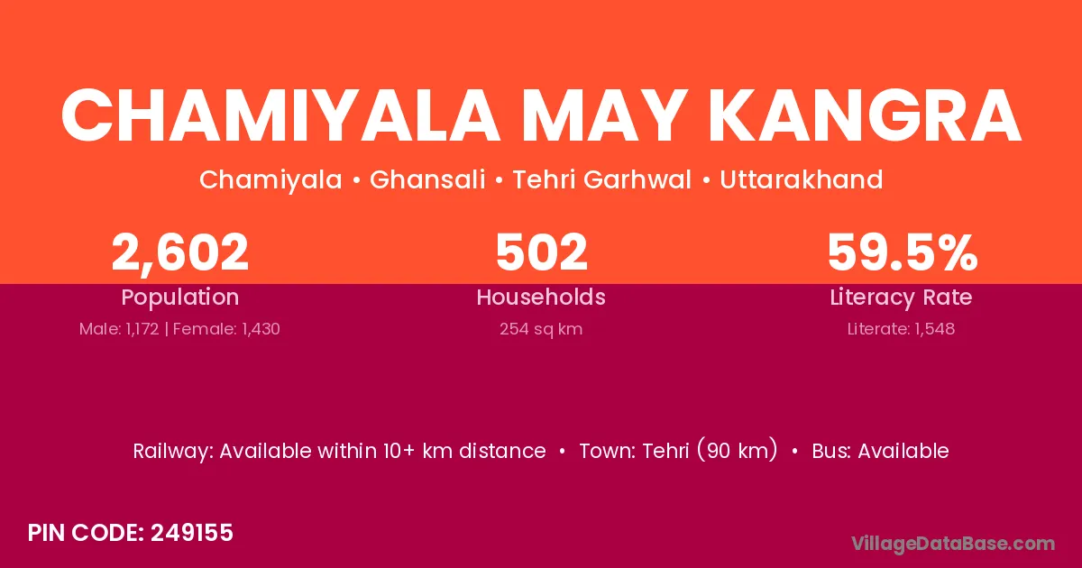 Tehri (90 km) is the nearest town to Chamiyala May Kangra village for major economic activities and is located approximately 90 km away.