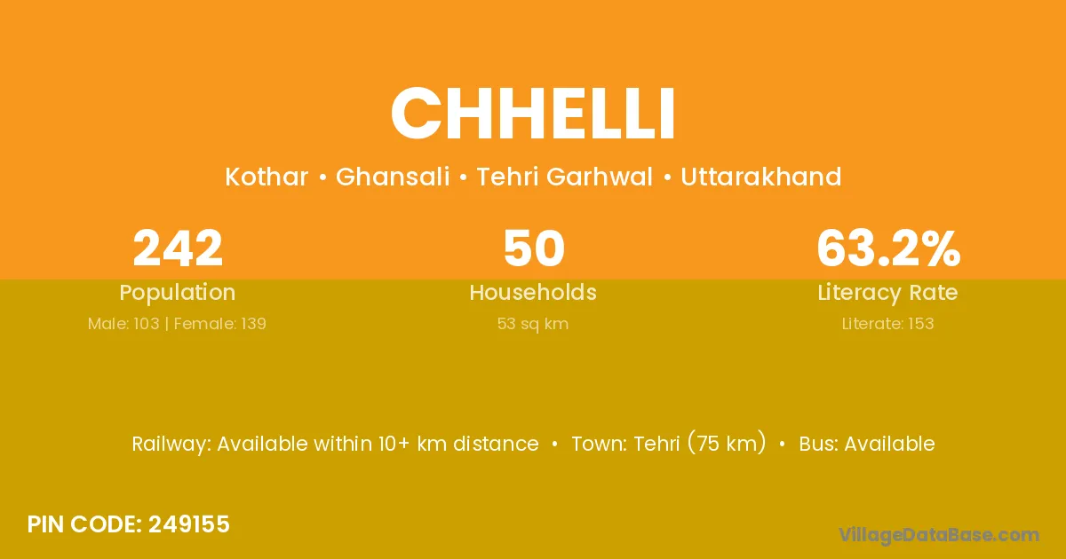 Tehri (75 km) is the nearest town to Chhelli village for major economic activities and is located approximately 75 km away.