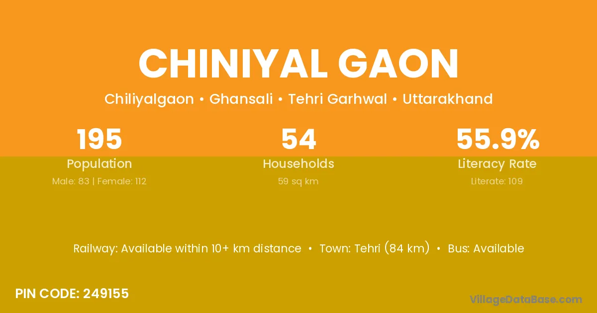 Tehri (84 km) is the nearest town to Chiniyal Gaon village for major economic activities and is located approximately 84 km away.