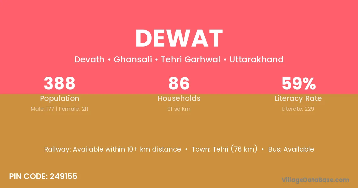 Tehri (76 km) is the nearest town to Dewat village for major economic activities and is located approximately 76 km away.