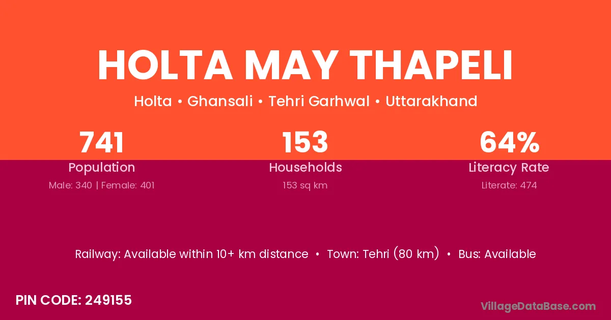Tehri (80 km) is the nearest town to Holta May Thapeli village for major economic activities and is located approximately 80 km away.