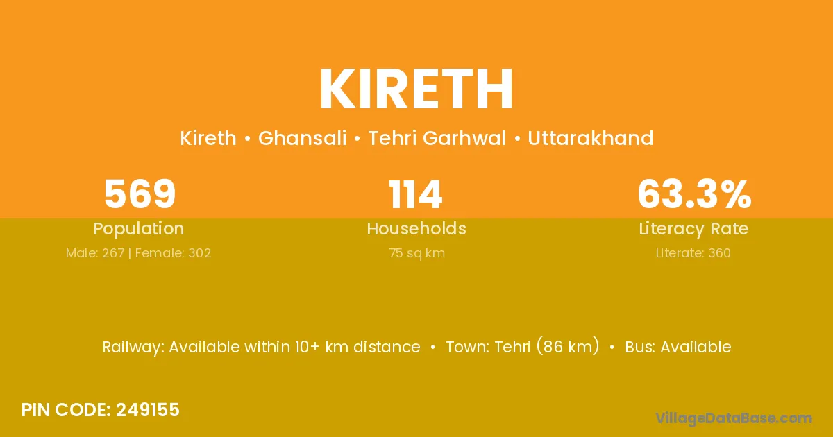 Tehri (86 km) is the nearest town to Kireth village for major economic activities and is located approximately 86 km away.