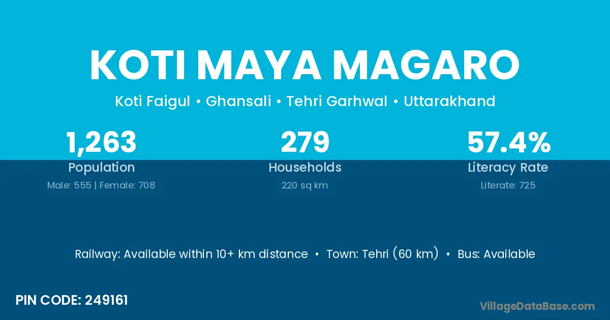 Tehri (60 km) is the nearest town to Koti Maya Magaro village for major economic activities and is located approximately 60 km away.