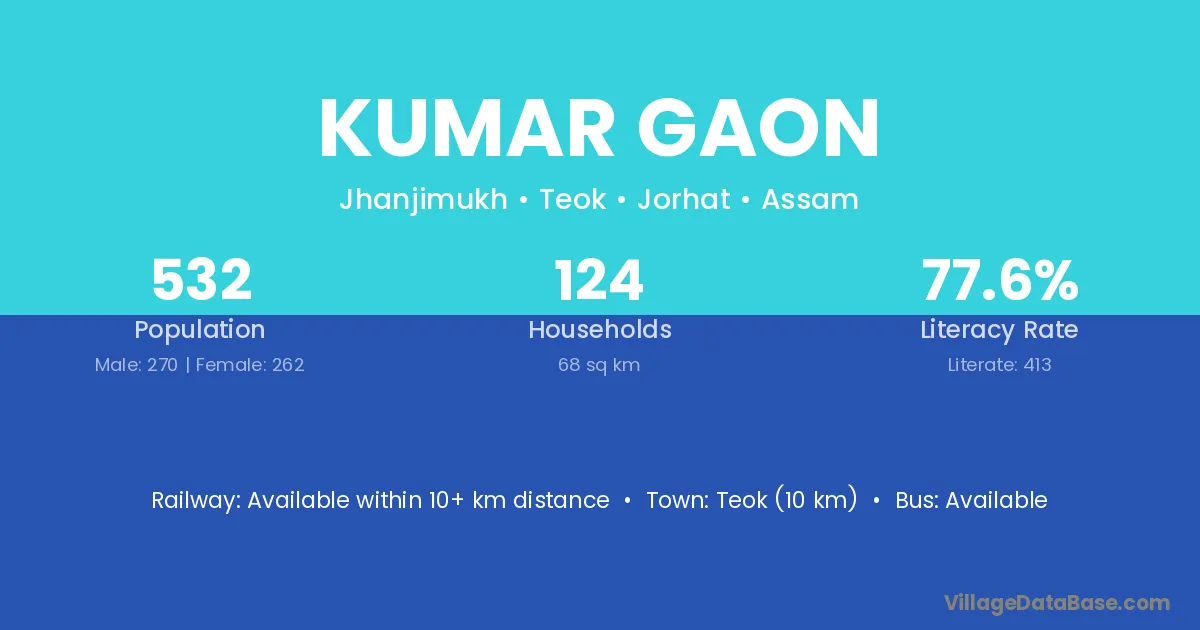 Kumar Gaon village has a total population of 255 people, of which 96 are males and 159 are females.