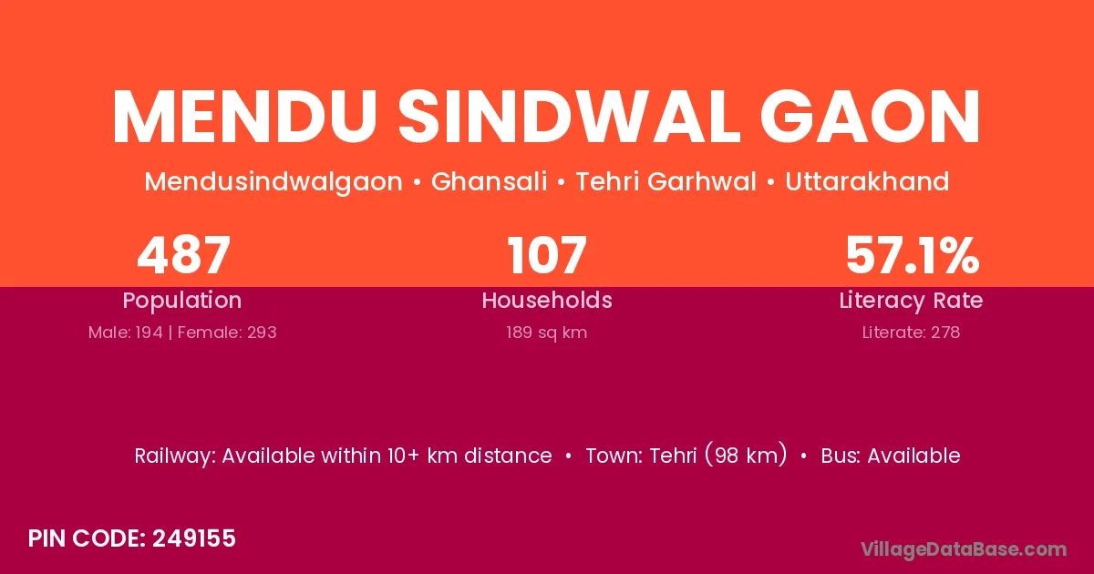 Mendu Sindwal Gaon village has a total population of 487 people, of which 194 are males and 293 are females.