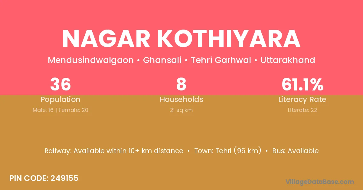 Tehri (95 km) is the nearest town to Nagar Kothiyara village for major economic activities and is located approximately 95 km away.