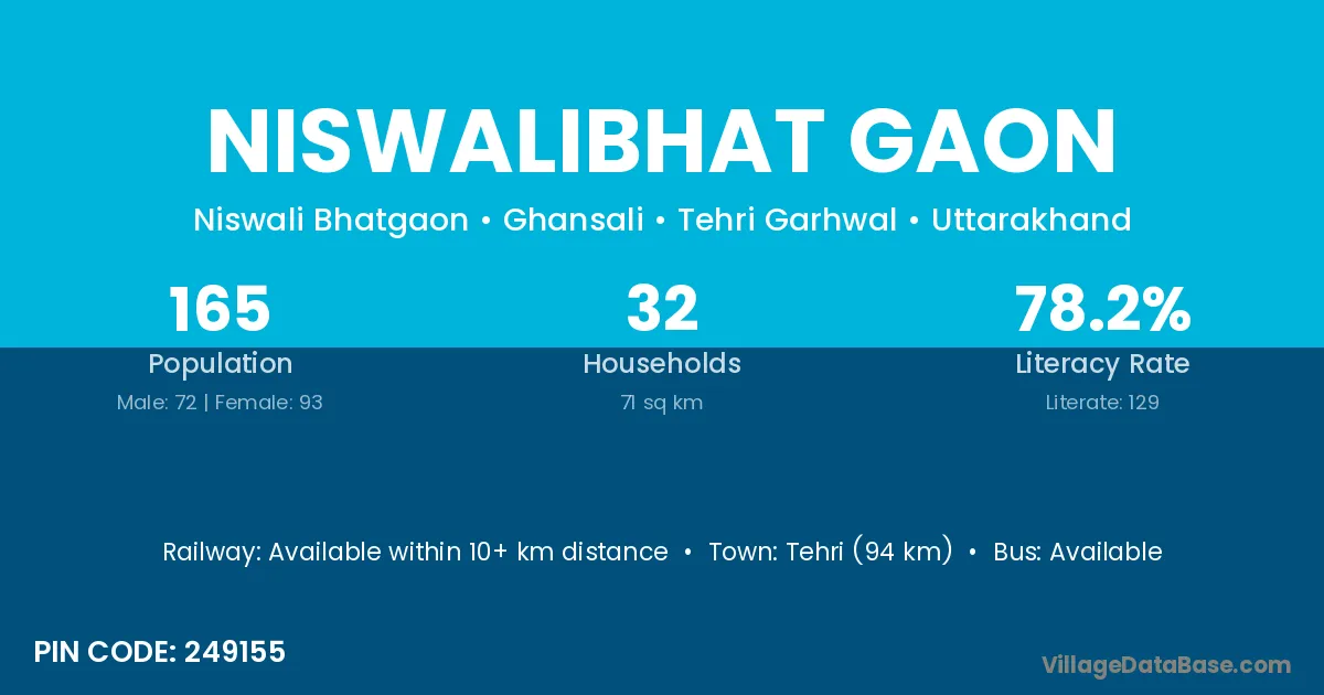 Tehri (94 km) is the nearest town to Niswalibhat Gaon village for major economic activities and is located approximately 94 km away.
