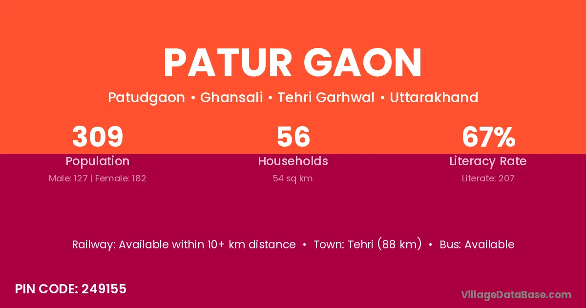 Tehri (88 km) is the nearest town to Patur Gaon village for major economic activities and is located approximately 88 km away.