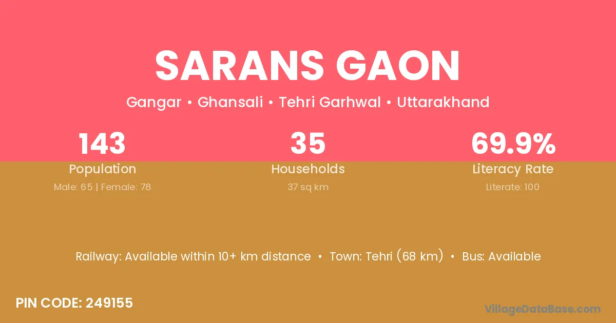 Tehri (68 km) is the nearest town to Sarans Gaon village for major economic activities and is located approximately 68 km away.
