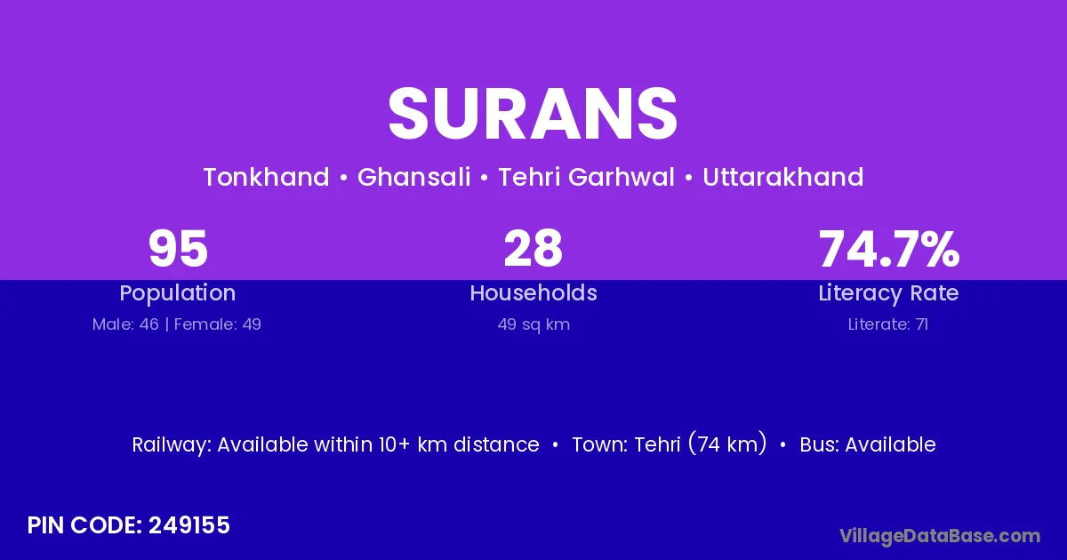 Tehri (74 km) is the nearest town to Surans village for major economic activities and is located approximately 74 km away.