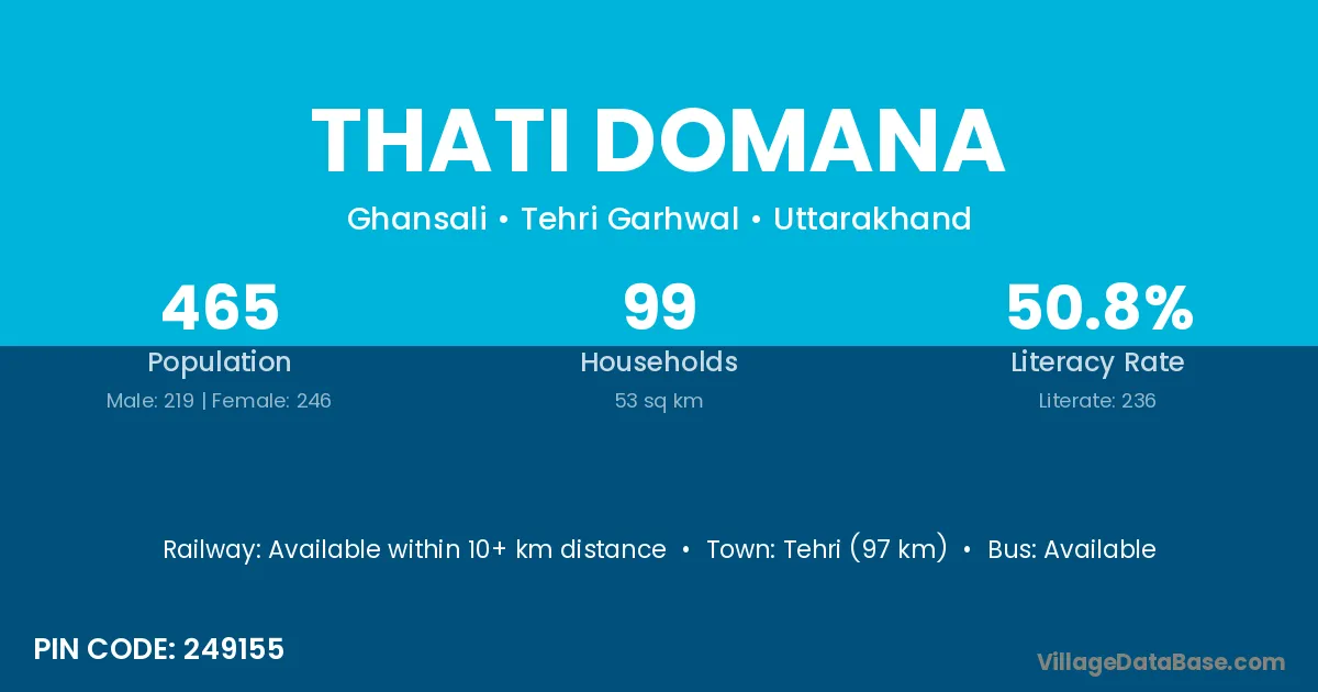 Tehri (97 km) is the nearest town to Thati Domana village for major economic activities and is located approximately 97 km away.