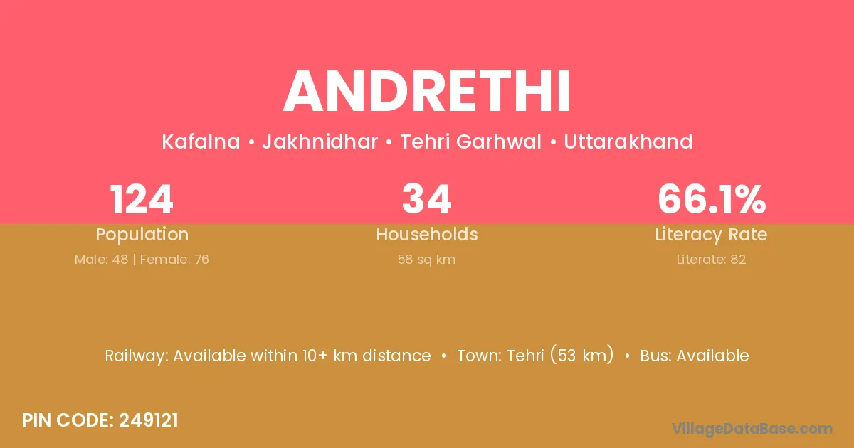 Tehri (53 km) is the nearest town to Andrethi village for major economic activities and is located approximately 53 km away.