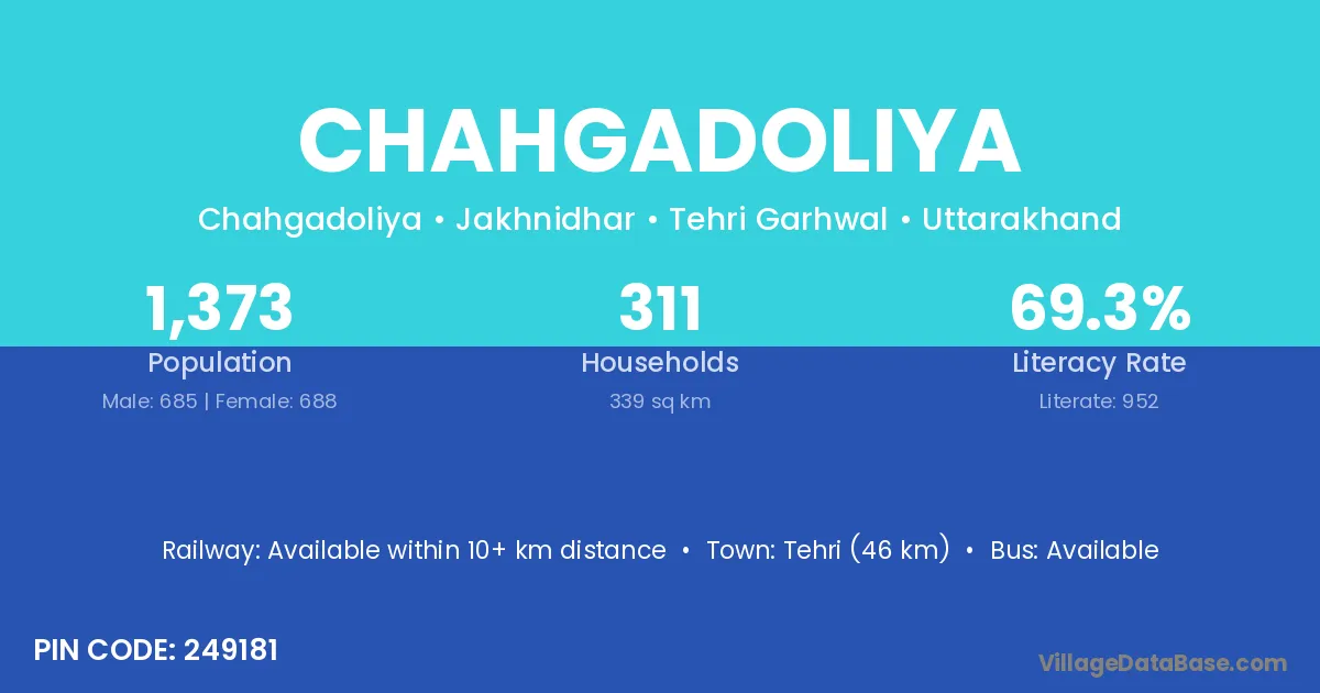 Tehri (46 km) is the nearest town to Chahgadoliya village for major economic activities and is located approximately 46 km away.