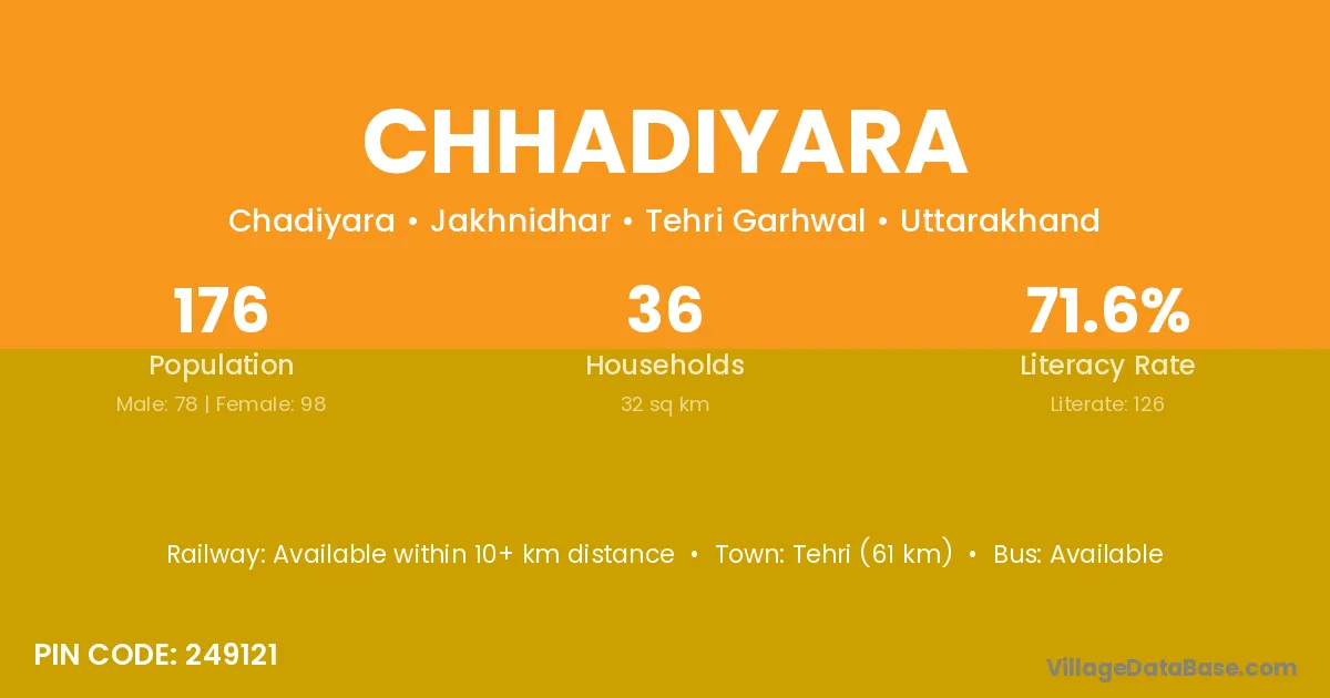 Tehri (61 km) is the nearest town to Chhadiyara village for major economic activities and is located approximately 61 km away.