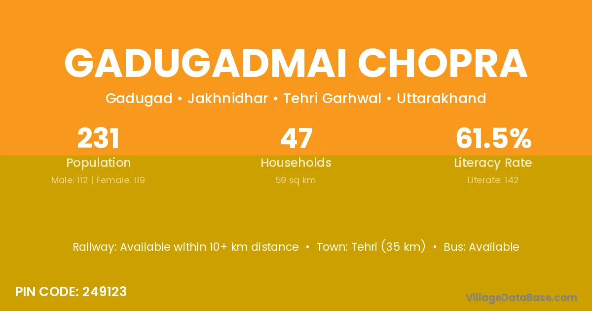 Tehri (35 km) is the nearest town to Gadugadmai Chopra village for major economic activities and is located approximately 35 km away.