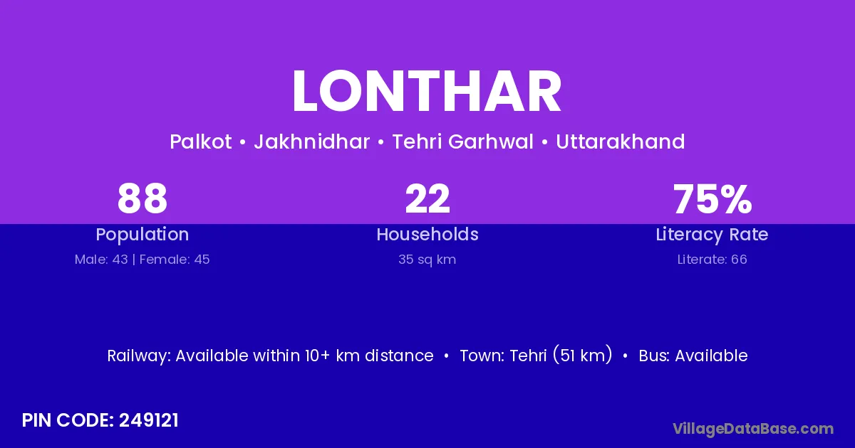 Tehri (51 km) is the nearest town to Lonthar village for major economic activities and is located approximately 51 km away.