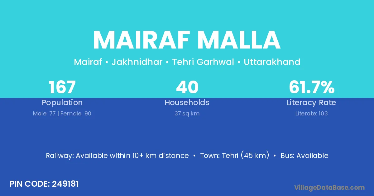 Tehri (45 km) is the nearest town to Mairaf Malla village for major economic activities and is located approximately 45 km away.