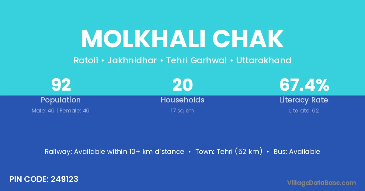Tehri (52 km) is the nearest town to Molkhali Chak village for major economic activities and is located approximately 52 km away.