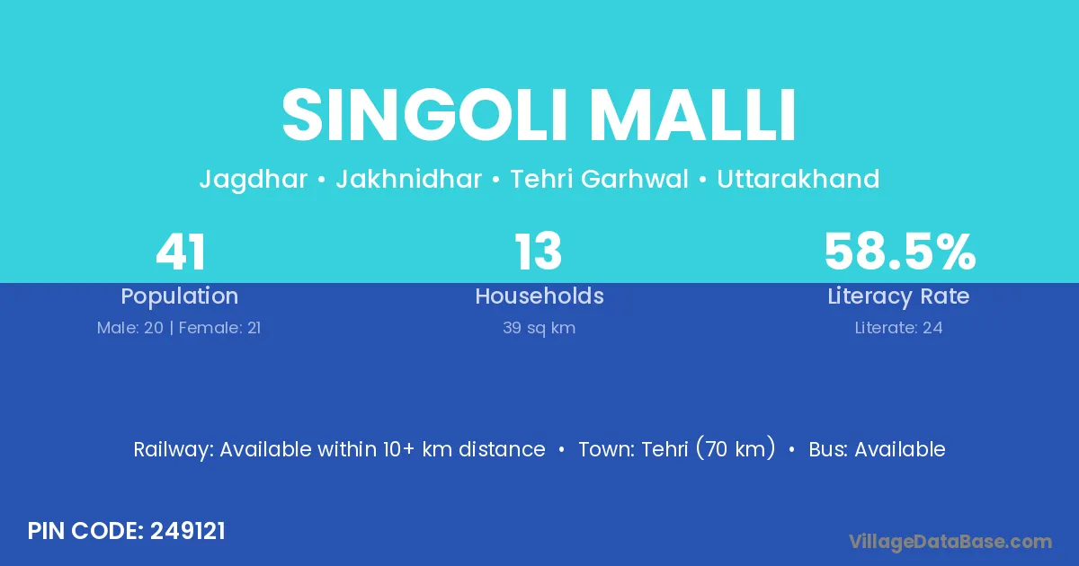 Tehri (70 km) is the nearest town to Singoli Malli village for major economic activities and is located approximately 70 km away.