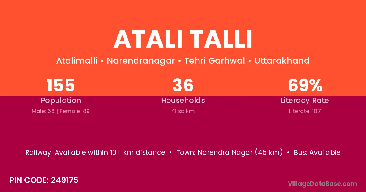 Narendra Nagar (45 km) is the nearest town to Atali Talli village for major economic activities and is located approximately 45 km away.