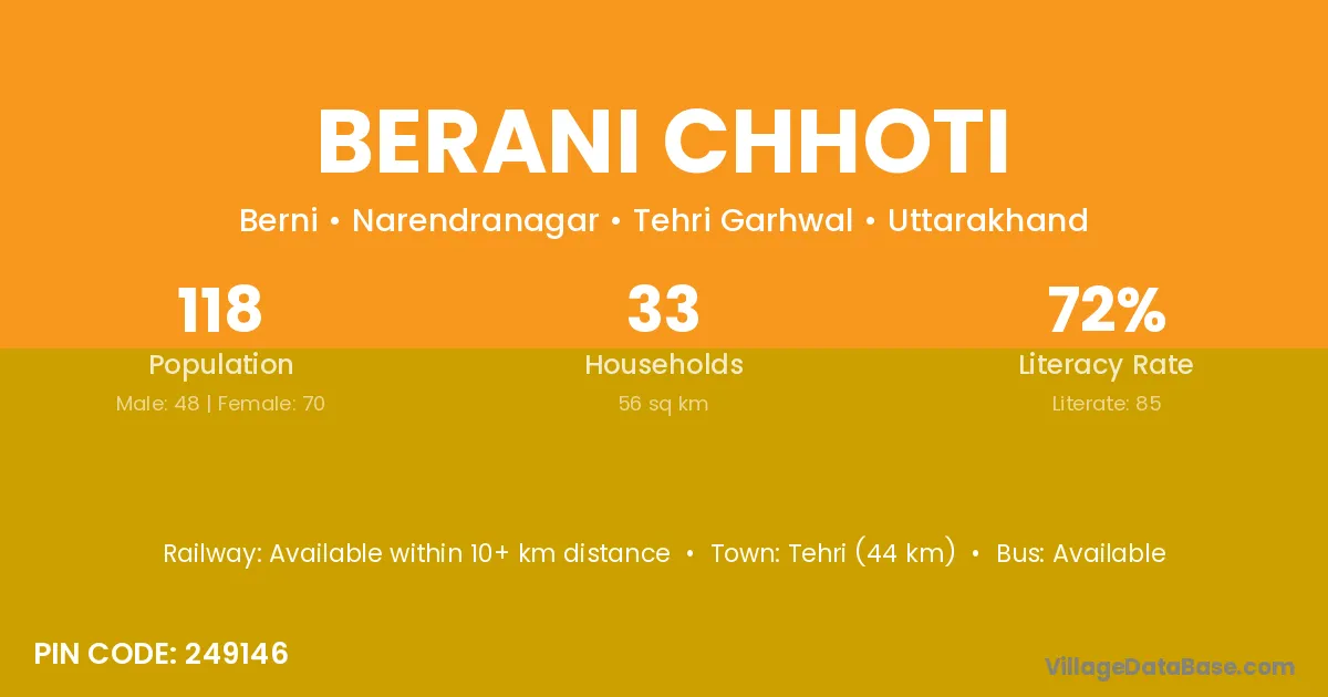 Tehri (44 km) is the nearest town to Berani Chhoti village for major economic activities and is located approximately 44 km away.