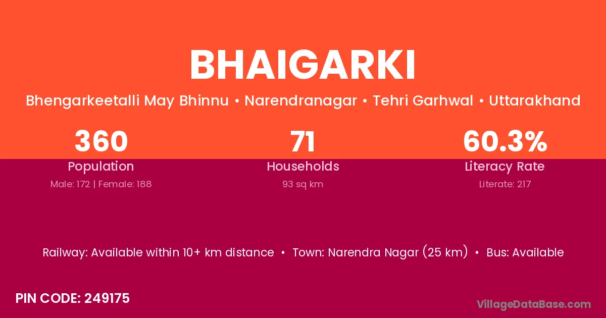 Narendra Nagar (25 km) is the nearest town to Bhaigarki village for major economic activities and is located approximately 25 km away.