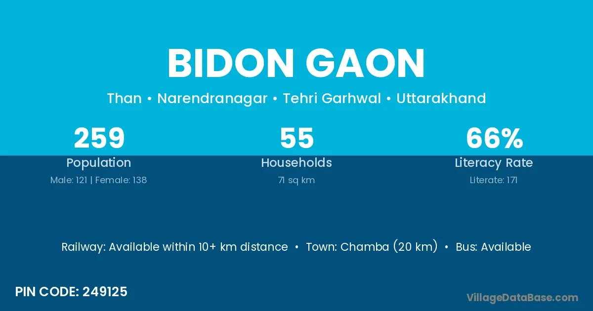 Chamba (20 km) is the nearest town to Bidon Gaon village for major economic activities and is located approximately 20 km away.