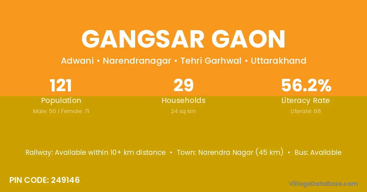 Gangsar Gaon village has a total population of 121 people, of which 50 are males and 71 are females.