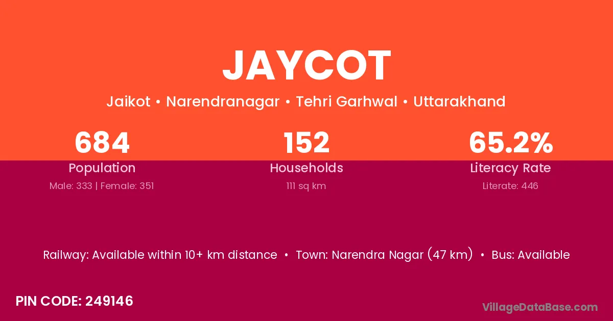Narendra Nagar (47 km) is the nearest town to Jaycot village for major economic activities and is located approximately 47 km away.