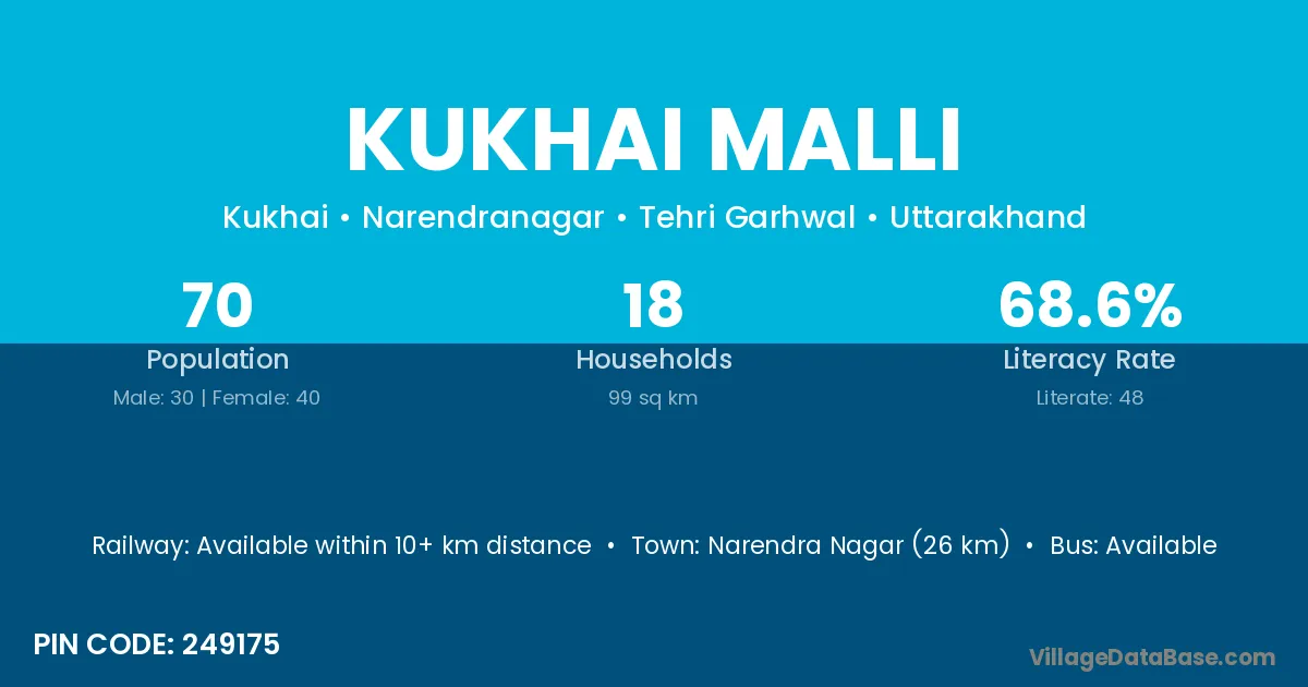 Narendra Nagar (26 km) is the nearest town to Kukhai Malli village for major economic activities and is located approximately 26 km away.