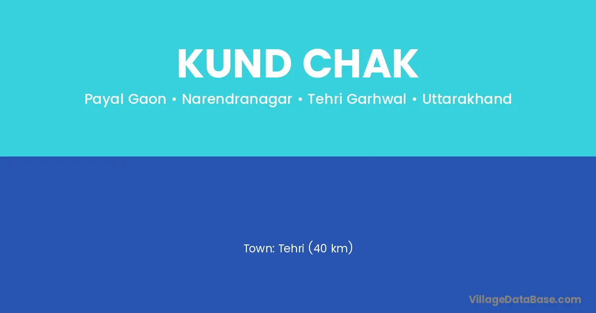 Tehri (40 km) is the nearest town to Kund Chak village for major economic activities and is located approximately 40 km away.