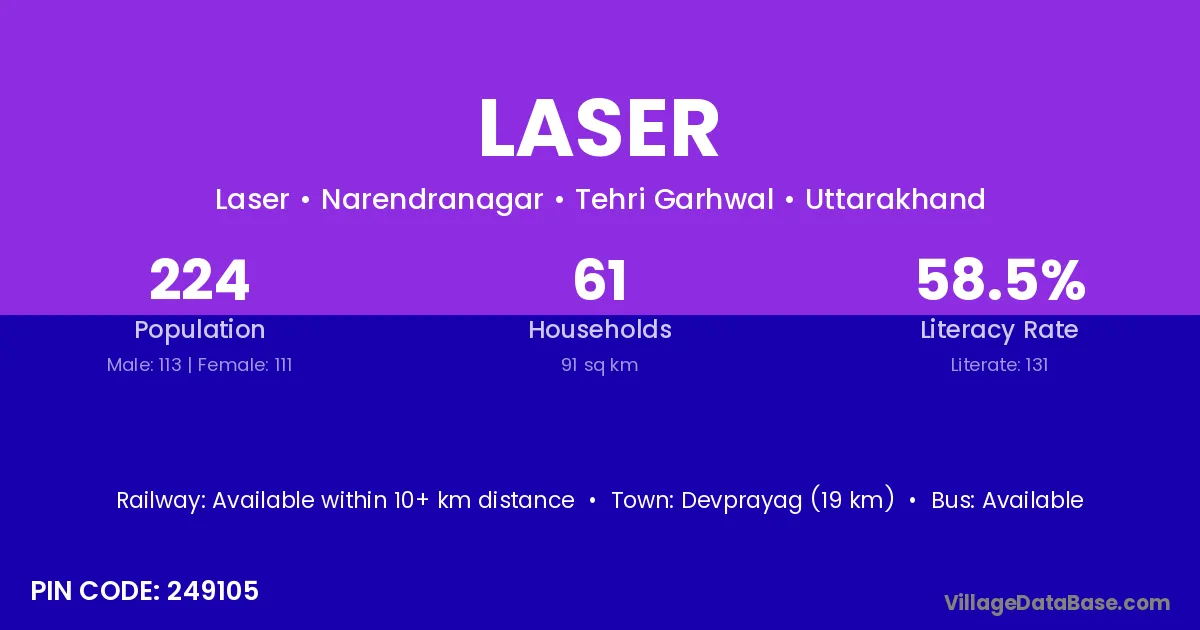 Devprayag (19 km) is the nearest town to Laser village for major economic activities and is located approximately 19 km away.