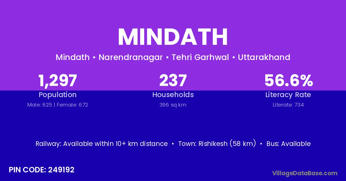 Rishikesh (58 km) is the nearest town to Mindath village for major economic activities and is located approximately 58 km away.