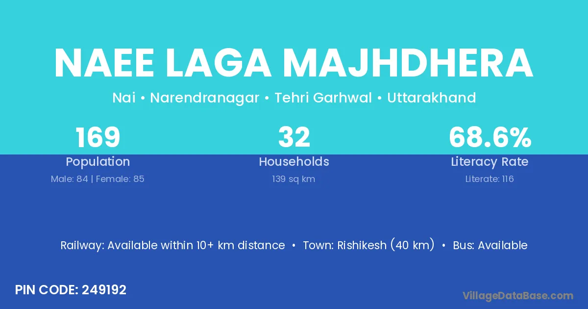 Rishikesh (40 km) is the nearest town to Naee Laga Majhdhera village for major economic activities and is located approximately 40 km away.