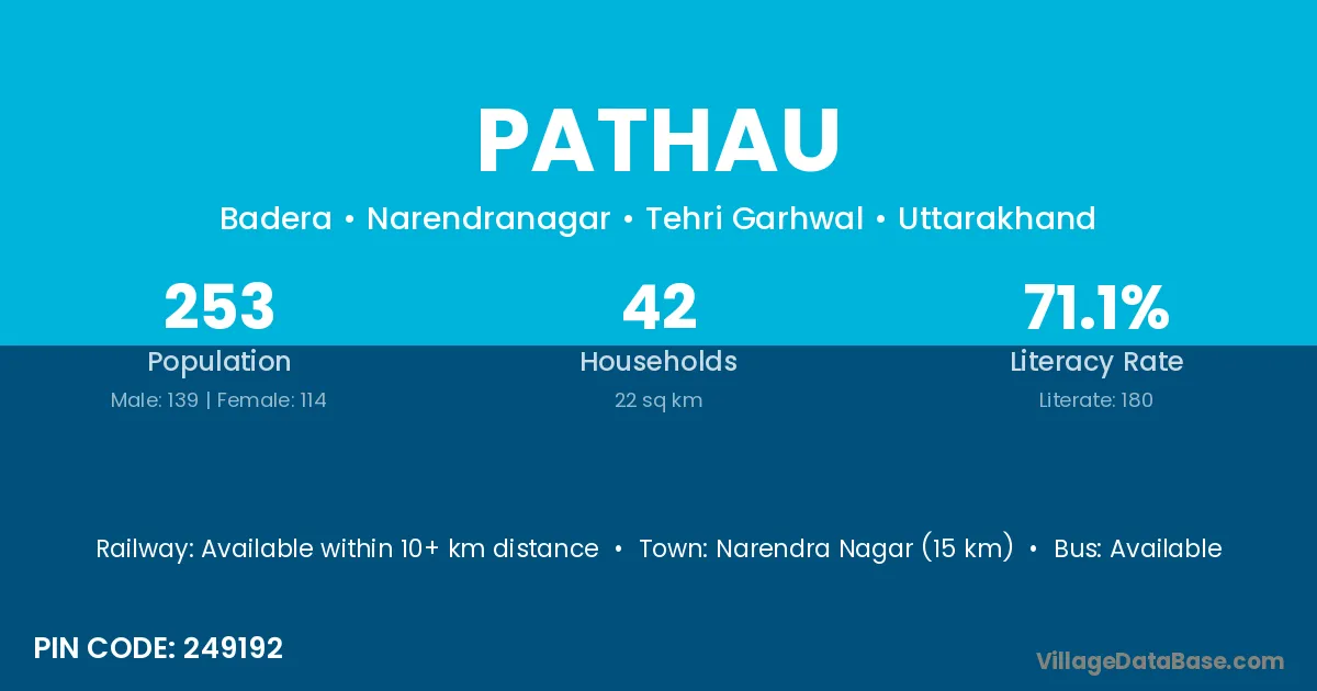 Narendra Nagar (15 km) is the nearest town to Pathau village for major economic activities and is located approximately 15 km away.