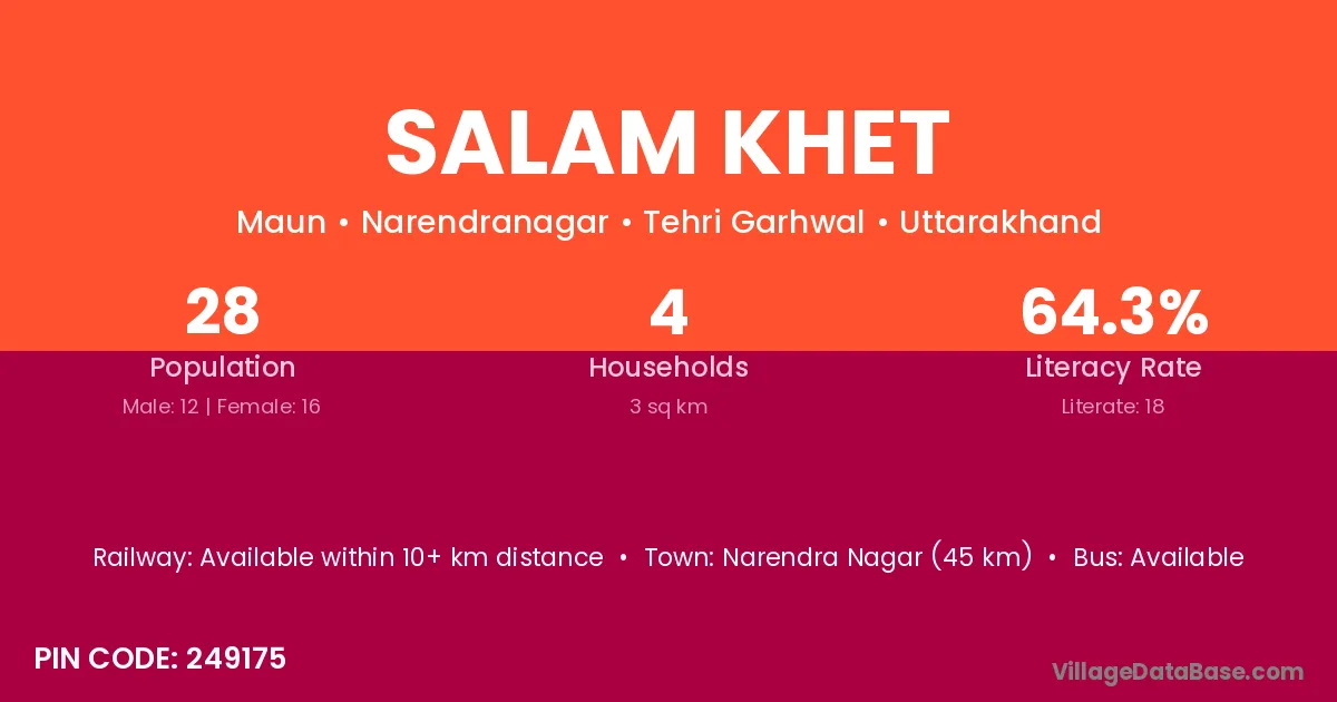 Narendra Nagar (45 km) is the nearest town to Salam Khet village for major economic activities and is located approximately 45 km away.