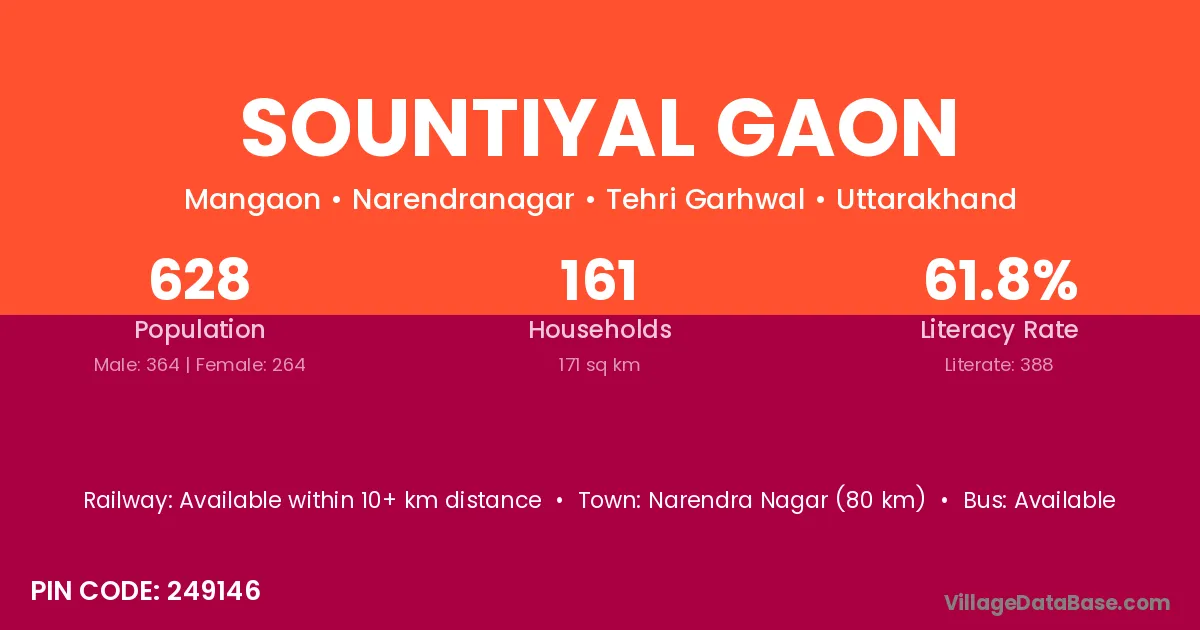 Sountiyal Gaon village has a total population of 628 people, of which 364 are males and 264 are females.