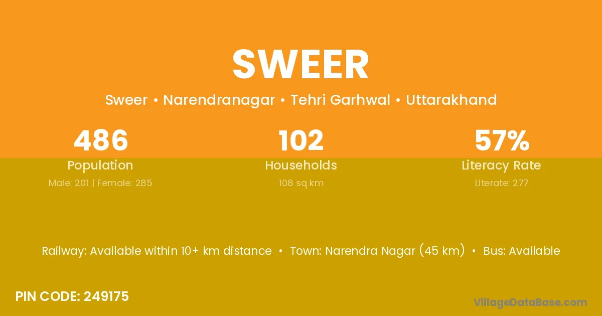 Narendra Nagar (45 km) is the nearest town to Sweer village for major economic activities and is located approximately 45 km away.