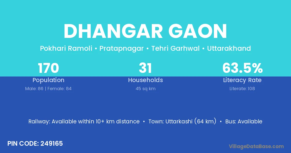 Uttarkashi (64 km) is the nearest town to Dhangar Gaon village for major economic activities and is located approximately 64 km away.