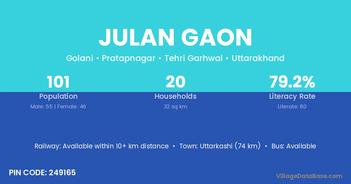 Uttarkashi (74 km) is the nearest town to Julan Gaon village for major economic activities and is located approximately 74 km away.