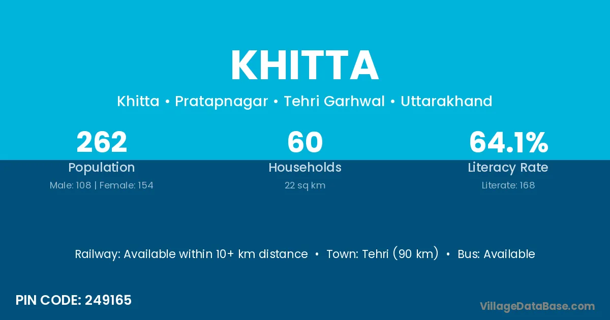 Tehri (90 km) is the nearest town to Khitta village for major economic activities and is located approximately 90 km away.