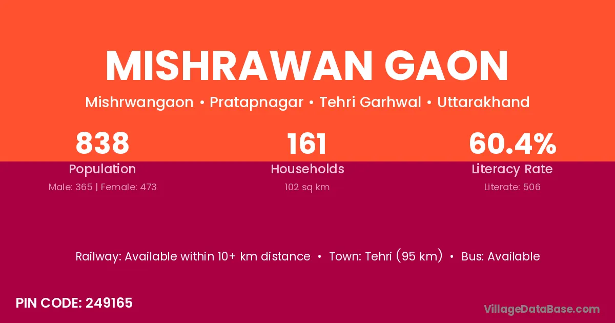 Tehri (95 km) is the nearest town to Mishrawan Gaon village for major economic activities and is located approximately 95 km away.