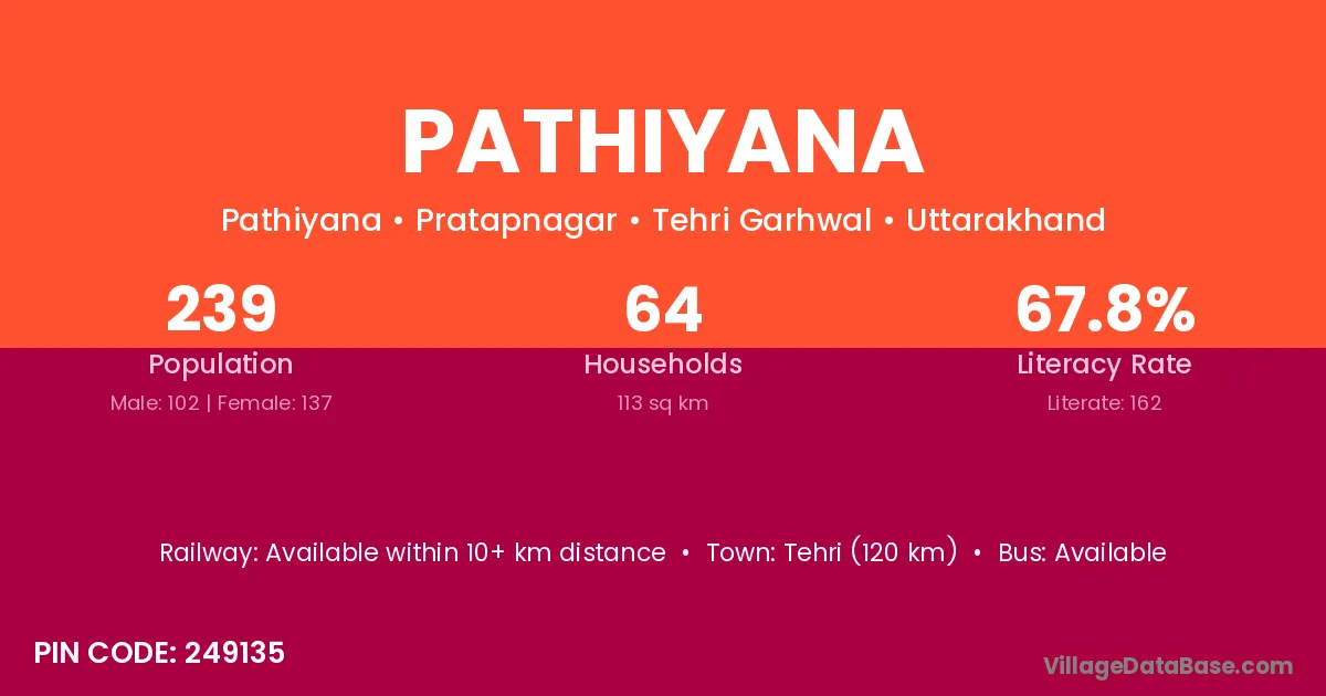Tehri (120 km) is the nearest town to Pathiyana village for major economic activities and is located approximately 120 km away.