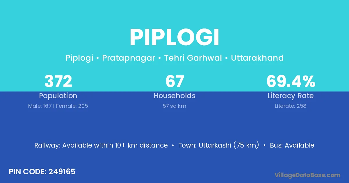 Uttarkashi (75 km) is the nearest town to Piplogi village for major economic activities and is located approximately 75 km away.