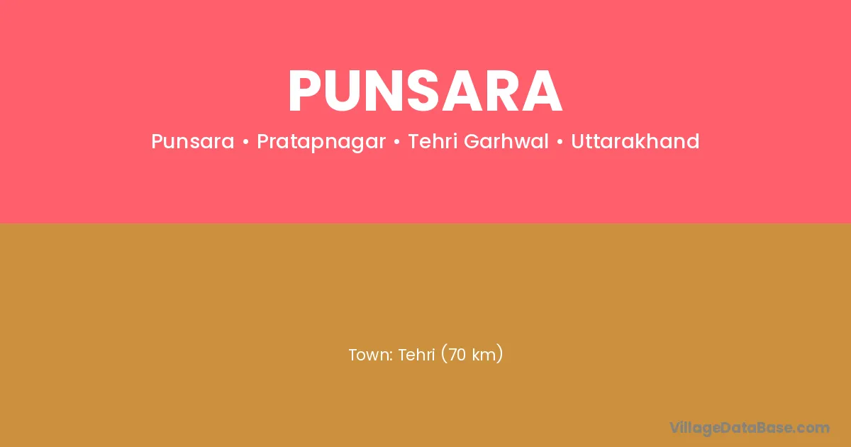 Tehri (70 km) is the nearest town to Punsara village for major economic activities and is located approximately 70 km away.