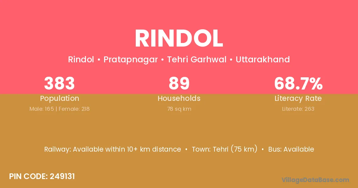 Tehri (75 km) is the nearest town to Rindol village for major economic activities and is located approximately 75 km away.