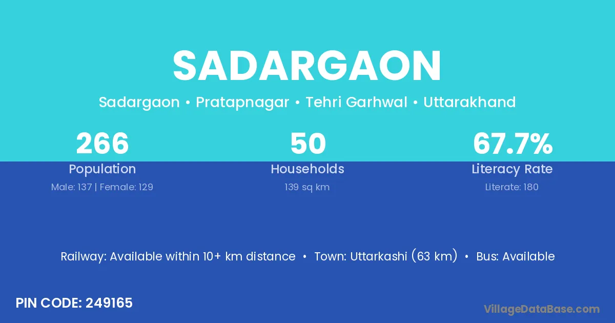 Uttarkashi (63 km) is the nearest town to Sadargaon village for major economic activities and is located approximately 63 km away.