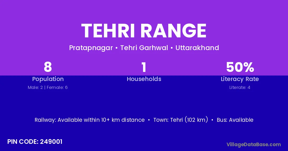 Tehri (102 km) is the nearest town to Tehri Range village for major economic activities and is located approximately 102 km away.
