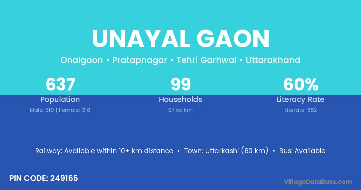 Uttarkashi (60 km) is the nearest town to Unayal Gaon village for major economic activities and is located approximately 60 km away.